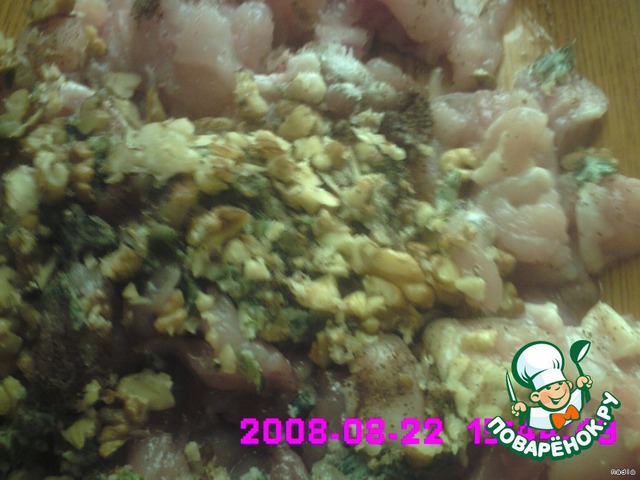 • Чеснок , петрушку, масло, рубленные грецкие орехи выкладываем в фарш, солим, перчим (черный перец) и перемешиваем.