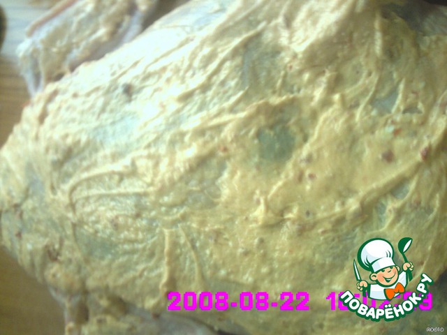 Смазываем осторожно курицу со всех сторон полученной смесью и выкладываем на смазаный противень, вокруг укладываем картофель, он поможет сформировать курицу окончательно.