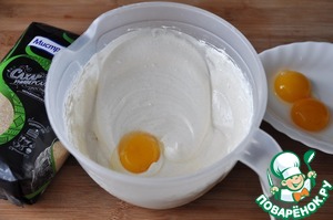 Добавляем по одному желтки и продолжаем взбивать.