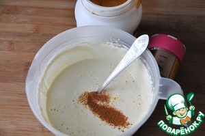 Кладём мёд, мускатный орех, имбирь и корицу и ещё раз взбиваем около 20 секунд.