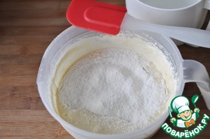 Добавляем просеянную, смешанную с разрыхлителем муку и аккуратно перемешиваем лопаткой.