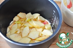 На дно чаши наливаем немного теста, иначе яблоки могут прилипнуть и подгореть. Кладём яблоки. Если они слиплись, то разделяем, чтобы тесто заполнило все промежутки. -