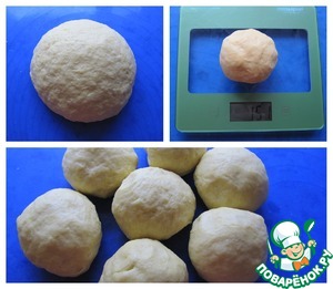 Тесто разделить на 7-8 частей. У меня из этого количества получилось 7 колобков по 150 г.