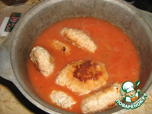 Перекладываем котлеты в глубокую кастрюлю. Заливаем соусом и оставляем тушить на 20 минут.