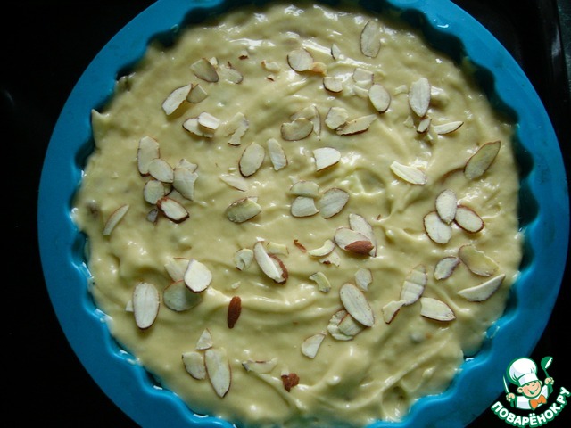 Выложить оставшееся тесто и посыпать миндальными лепестками. Выпекать в предварительно разогретой духовке при 180 градусах 30 минут (ориентируйтесь по своей духовке)до сухой спички