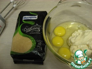 Итак взбиваем миксером 2 яйца, 1 желток, майонез и сахар коричневый "Мистраль"