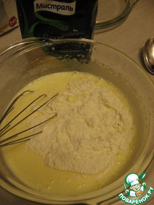 Теперь добавляем муку, смешанную с содой. Гасить соду не нужно, так как в майонезе есть достаточное количество кислоты для реакции. Вымешиваем аккуратно лопаточкой ли венчиком до гладкости