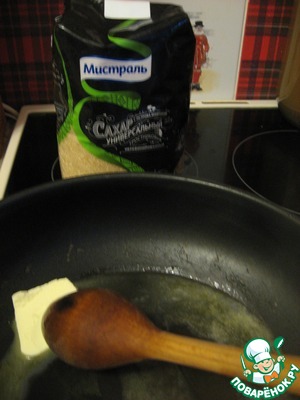 В сковороде растопим 50 гр. сливочного масла, насыпем 1/2 стакана коричневого сахара "Мистраль" и дождемся, когда сахар начнет карамелизоваться