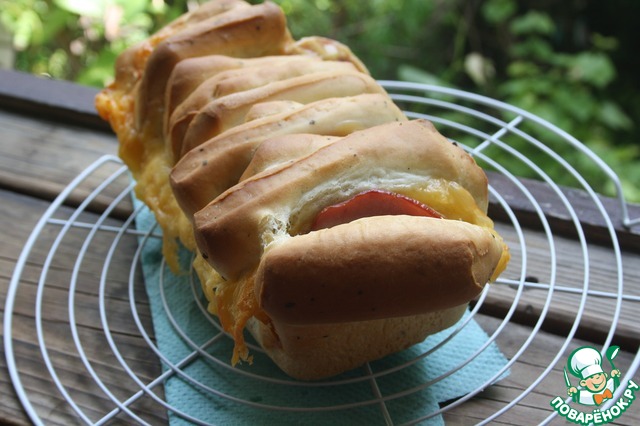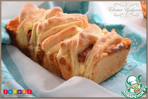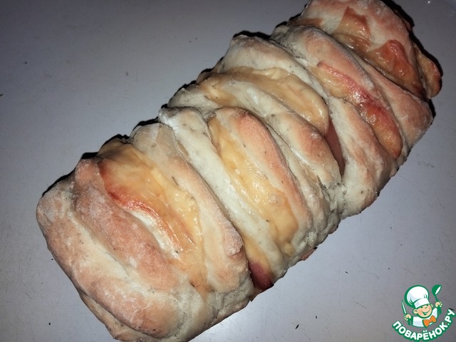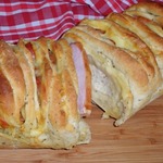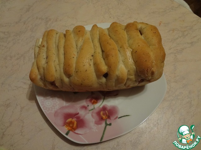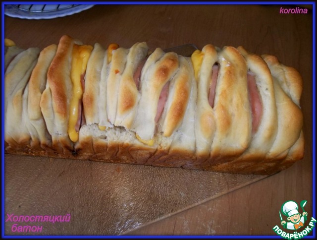 Хочу сегодня предложить вашему вниманию очень оригинальный и вкусный батон. Рецепт найден на просторах Интернета. Очень нежное ароматное тесто и вкусная начинка из ветчины и сыра. Заходите ко мне в гости и я Вас угощу.