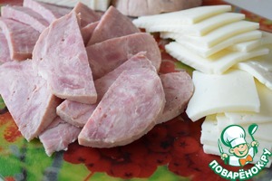 Нарезаем ветчину тонкими полукругами, сыр - пластиками.