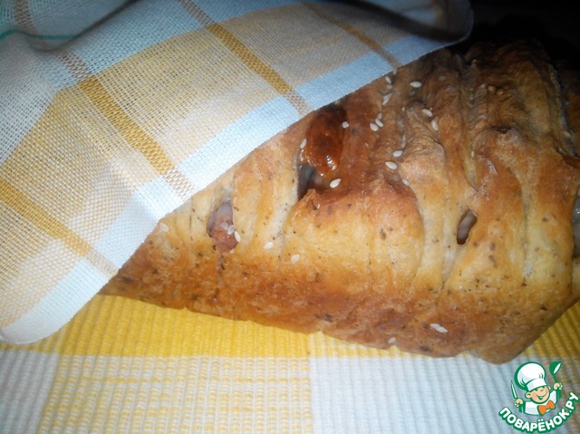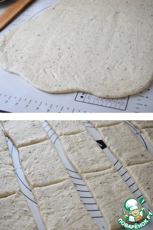 Подошедшее тесто раскатываем толщиной 5-7 мм и нарезаем прямоугольниками (ширина прямоугольника=ширине сыра и ветчины, а длина - примерно 2, 5 длины сыра)