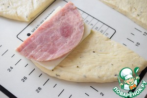 На кусочек теста кладем сыр и ветчину. Тесто свернем пополам.