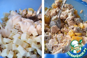 Куриную грудку (или филе) отварить до готовности в сильно соленой воде с добавлением лаврового листа и перца горошка. Вытащить отваренное мясо и остудить. Порезать небольшими кубиками.