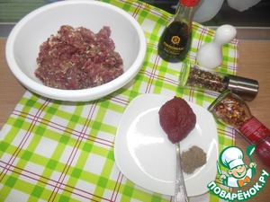 Говядину, свинину и грудинку пропустить через мясорубку, добавить 1 луковицу. Фарш хорошо вымешать.