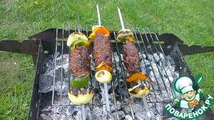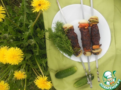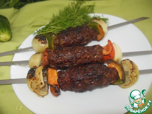 На шампур надеваем лук, сладкий перец, из фарша формируем колбаску, и опять перец и лук.