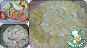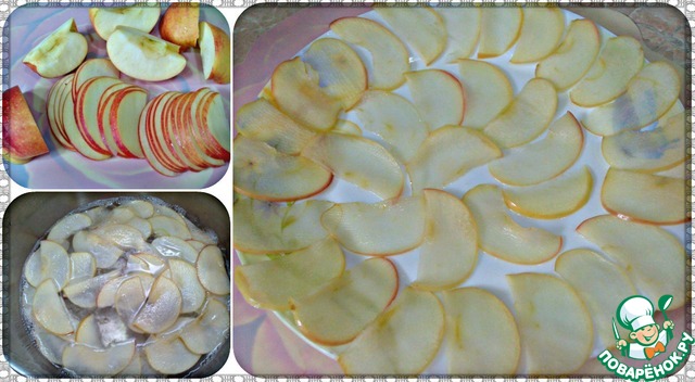 Подготовим яблоки для розочек. Яблоки разрезать на 4 части, вырезать сердцевину, порезать тонкими дольками и варить в сиропе минут 5. Для сиропа нужно закипятить воду, добавить сахар и лимонную кислоту. Когда яблоки будут прозрачные, шумовкой выложите их на тарелочку и разложите, чтоб чуть-чуть подсохли пока занимаетесь тестом.