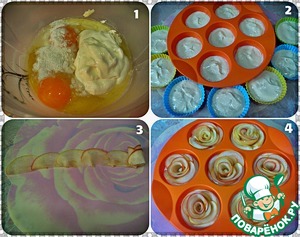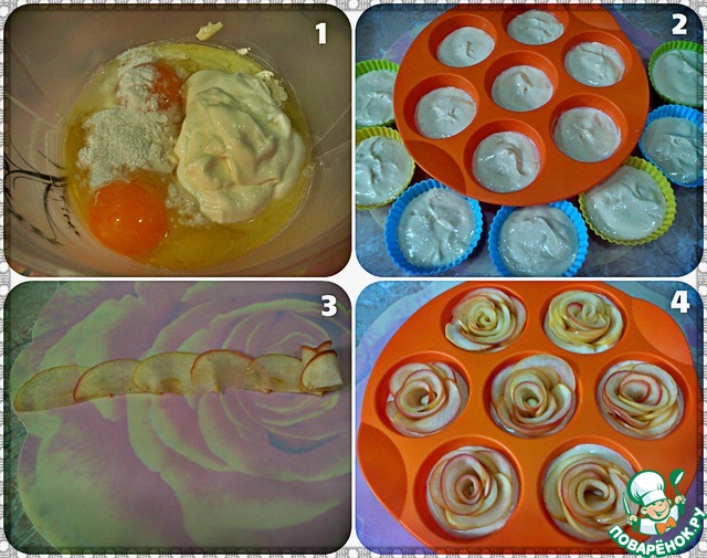 Далее добавляем яйца, сметану, разрыхлитель, соду, соль, ванилин и взбиваем еще минутки 2. Затем добавляем муку, тщательно перемешиваем и разливаем по формочкам. Яблочные дольки положите на доску, чтоб края немного ложились друг на друга и начинаем сворачивать рулетик. Получившуюся розочку выкладываем сверху на кексики и аккуратно разравниваем, придавая красивую форму и вид. Для красивых и пышных розочек нужно брать не менее 10 долек. Ставим наши кексики в заранее разогретую духовку и выпекаем 30-40 минут при температуре 180 градусов. Ориентируйтесь по своей духовке.
