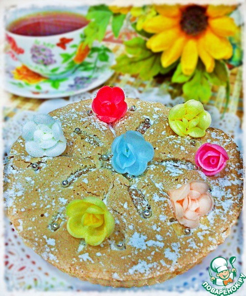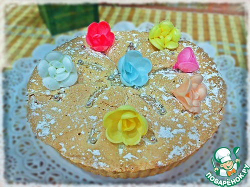 По истечении времени проверьте на готовность. Проткните зубочисткой, если останется сухая, значит наш замечательный пирог готов и его можно достать из духовки. Накройте полотенцем и дайте остыть минут 10. Затем выложите в форму и украсьте по своему желанию. Я присыпала сахарной пудрой, положила кондитерские шарики блестящие и разложила вафельные цветочки.
