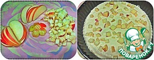 Теперь подготовим яблоки. Если кожура не толстая, то можно ее и не очищать. Часть яблок я порезала мелкими кубиками, а часть дольками тоненькими. Так же сделала еще цветочек для центра пирога, решила поэкспериментировать. Не люблю шарлотку с большим кол-вом яблок, поэтому кубики я ложу в нижнюю часть пирога, а дольками украшаю верх. В смазанную маслом форму выложить 1/3 часть теста и присыпать кубиками яблок. Чтоб яблоки не осели на дно, нужно их предварительно присыпать мукой. -