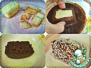 Бисквит порезать квадратиками или прямоугольниками (в зависимости от Вашей формы для выпечки, у меня получились прямоугольники). Края тонко обрезать. Далее обмакиваем края нашего бисквита в соусе. Если хотите чтоб пропиталось больше, можете держать в соусе секунд по 10. Дайте немного стечь соусу и затем обвалять все края в кокосовой стружке. Наши вкуснейшие пирожные готовы!