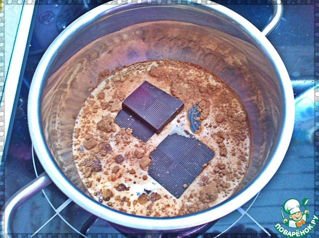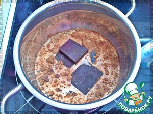 Приготовим соус. Молоко, сахар, шоколад и какао соединить в кастрюльке, довести до кипения и дать остыть.