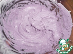 Сливки взбить до устойчивых пиков, добавить сахарную пудру, протереть размороженную чернику через сито.