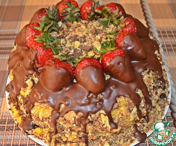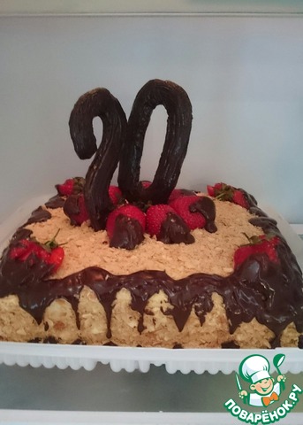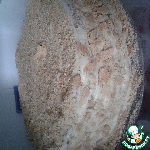 Готовые коржи обильно смазать кремом, оставив 2-3 коржа на крошку и немного крема для обмазывания. Оставить сначала при комнатной температуре на 1-2 часа, затем убрать в холодильник еще на 5-6 часов. Можно поставить сверху груз. Я этого не делала, торт и так сам оседает. Ровно обмазать готовый торт кремом и обсыпать крошкой. Украсить по своему желанию.