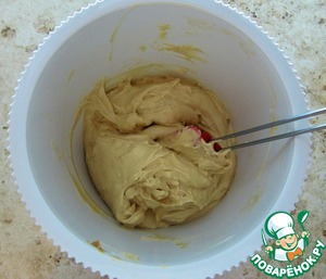 Муку смешать с крахмалом и разрыхлителем теста, просеять, аккуратно соединить жидкие и сухие ингредиенты методом складывания, до однородности.