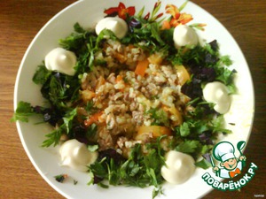Смешать рыбу и рис. Сверху украсить зеленью.
