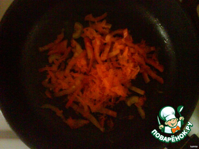 Болгарский перец разрезать пополам, удалить ножку и семена. Нарезать тонкой соломкой. И обжарить с морковью на слив. масле до получения аромата.