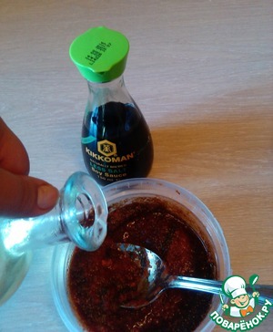 Для соуса смешиваем томатное пюре с соевым соусом "Киккоман", специями и сахаром