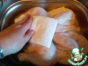 Вынимаем цыпленка из рассола, салфеткой удаляем лишнюю влагу.