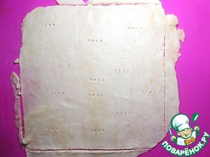 Каждый кусочек теста тонко раскатайте, вырежьте из него квадрат размером примерно 20 на 20 см. Я готовила "Наполеон" из 1/2 количества продуктов, поэтому еще делила корж на две прямоугольника. Обрезки теста пока отложите. Выпекайте каждый корж до легкого зарумянивания в духовке, нагретой предварительно до 210 градусов Цельсия в течение 5-6 минут.