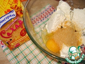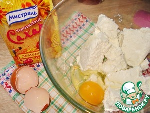 Конечно у бабы Нюры, рецепта не было все бралось " на глазок". В творог добавляем яйцо.
