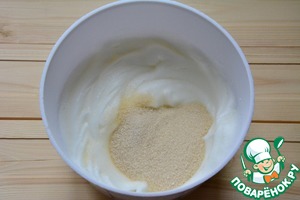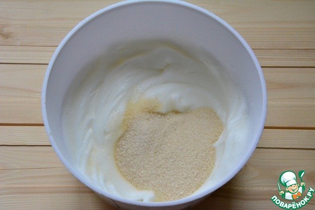 Всыпать 60 г сахара и ванилин в белки