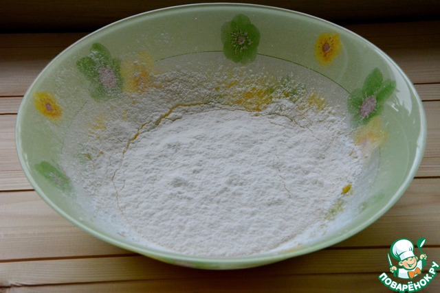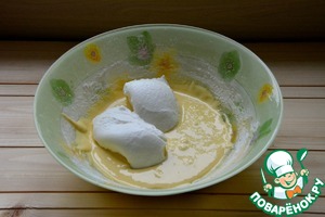 В желтковую массу всыпать 2 ст. л. просеянной муки, аккуратно размешать венчиком