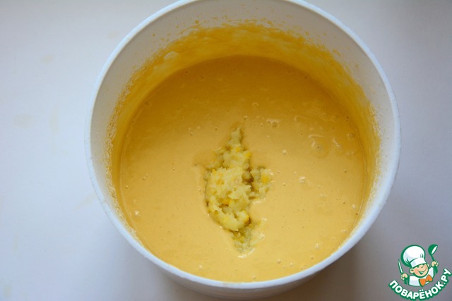 Всыпать просеянную муку и разрыхлитель. В тесто добавить лимонное пюре. Еще раз взбить.