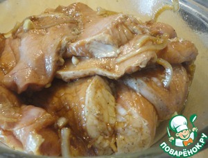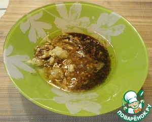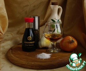 Для маринада нам нужны соевый соус Kikkoman, оливковое (или другое растительное масло), коньяк, давленый чеснок, свежемолотый черный перец.