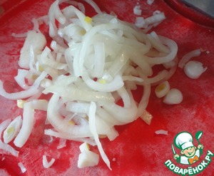 Лук режем полукольцами. Добавляем щепотку соли (она нужна для того, чтобы лук дал сок). Лук с солью хорошо перетираем.