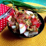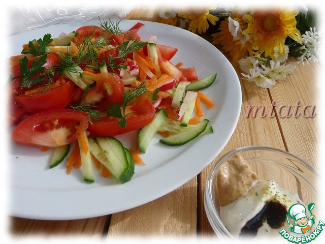 Вкусный, яркий и ароматный салат. Огурец и морковь я натерла, а помидоры и редиску порезала. Горчицу добавила острую и дижонскую, вместо йогурта -растительное масло и соевый соус не добавляла. Совершенно потрясающий и простой салат, полностью в нашем вкусе!