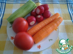 • Морковь, редис, огурец трем на терке, помидор режем кубиками.