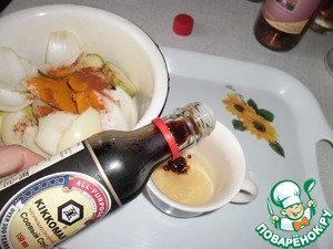 Смешать майонез, горчицу и соевый соус Киккоман.