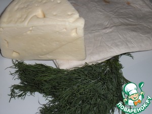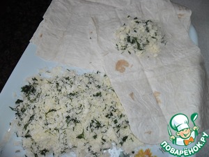 Готовим конвертики с сыром и укропом. Лаваш разрезать на большие прямоугольники. Сыр натереть, укроп помыть, обсушить и мелко нарезать.