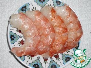 Креветки разморозить, помыть и очистить от головы и панциря.