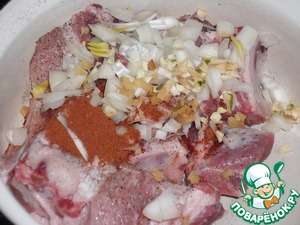Мясо посолить, посыпать луком, чесноком, имбирем и паприкой.