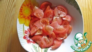 Дальше берем салатник и начинаем слоями выкладывать салат. Первый слой - помидоры тонкими пластинками.