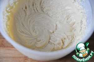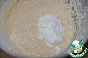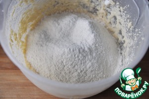 Вводим половину сметаны и половину просеянной с разрыхлителем муки, всё хорошо перемешиваем.