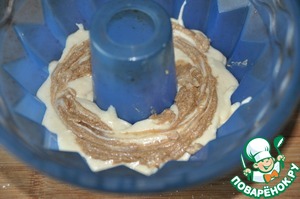 Далее опять наливаем 1/4 теста, а сверху кладём коричное тесто и опять делаем ножом разводы.