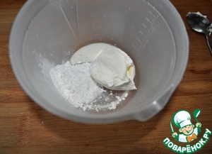 Берём творожный сыр, сахарную пудру, молоко и ванилин, взбиваем венчиком. -