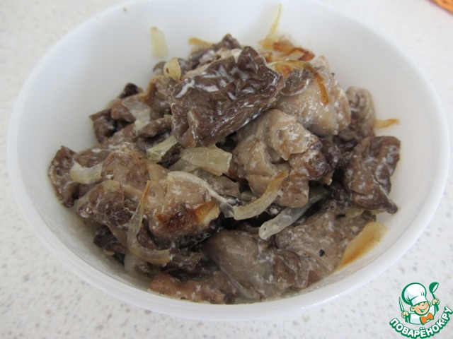Репчатый лук слегка обжарить и выложить грибы. Добавить соль, смесь 5 перцев и чуточку муки. Жарить, помешивая, минут 5.